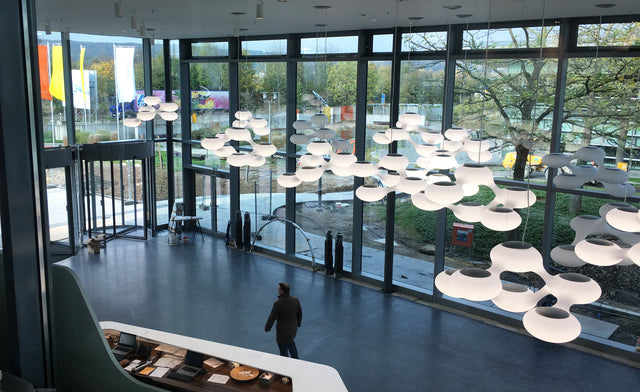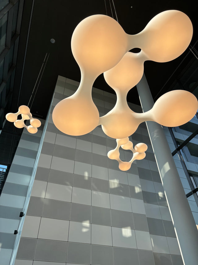 Ein Lichtobjekt, das jeden Raum gestaltet und belebt, das trotz seiner enormen Maße im Raum schwebt wie ein Himmelsobjekt. Gerundete Formen, verbunden zu einem scheinbar endlosen Band, bündeln das Licht wie aus dem Nichts kommend und geben es in einer in der Luft schwebenden Molekularstruktur in den Raum ab.