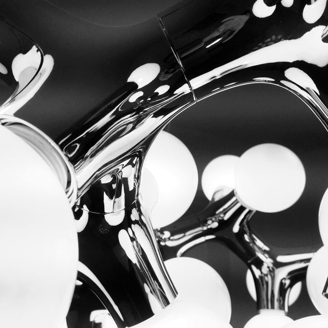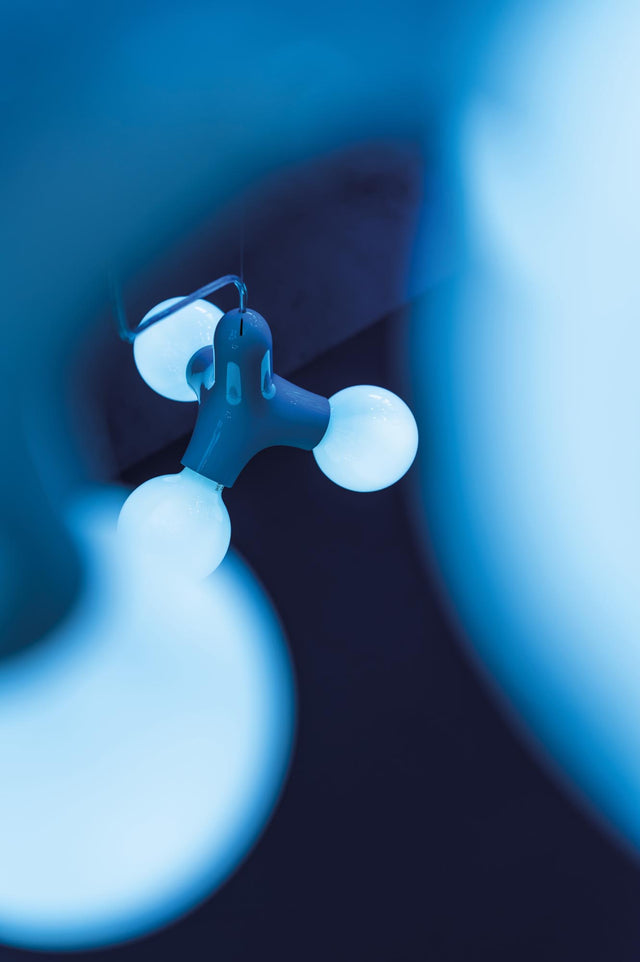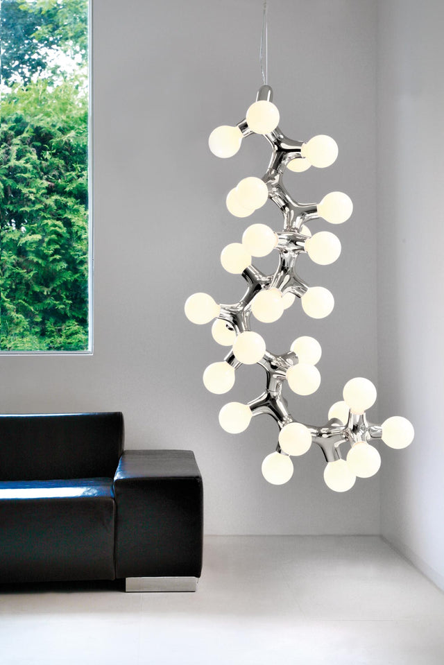 Wie eine organisch wachsende Struktur entwickelt sich die komplexe Form der Pendel-, Wand-, Decken- oder Tischleuchte aus einem überraschend einfachen Grundelement. Weiße, schwarze, farbige, verchromte oder kupferfarbene Module mit jeweils drei möglichen LED Globes addieren sich zum Lichtobjekt in Wunschgröße vom Singleformat bis zum raumgreifenden Kronleuchter.
