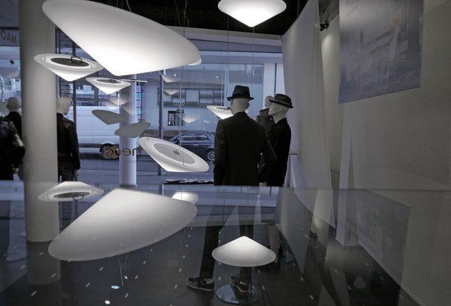 In the new concert hall "The Spheres" by Odradek Records in Montesilvano, three COSMOs play the main role alongside the grand piano. The only decorative elements in the otherwise bare room are acoustic wooden reliefs on the walls and the three COSMO lights in the air space. Both form the perfect stage for the free-standing grand piano. Concentration on the essentials, just like in the music.