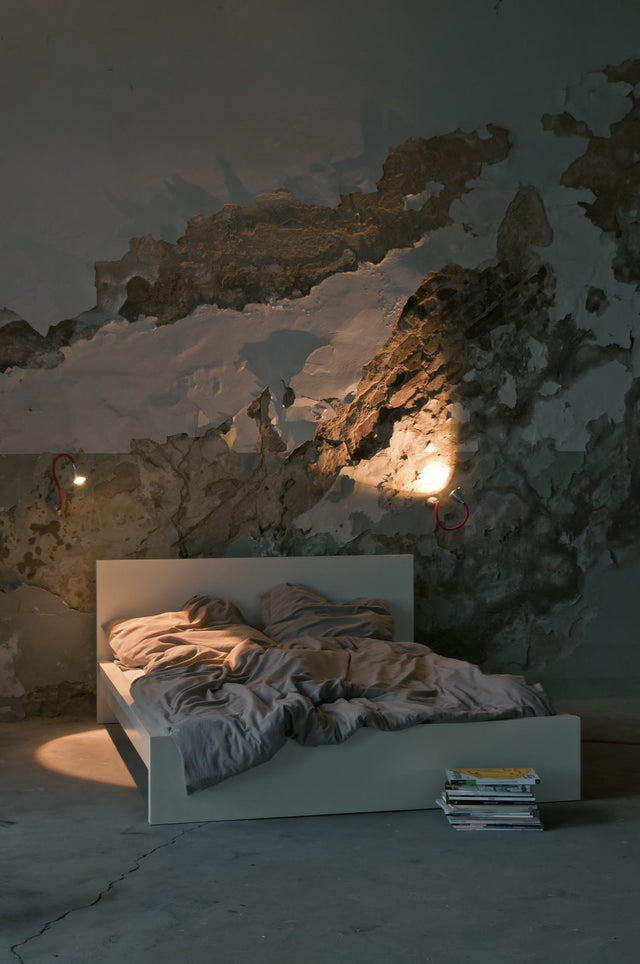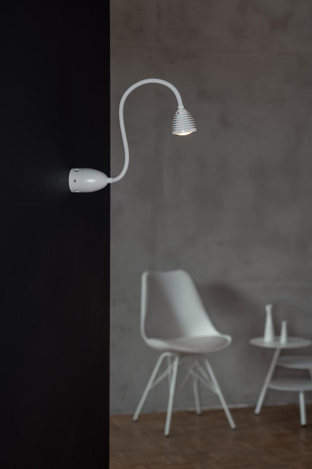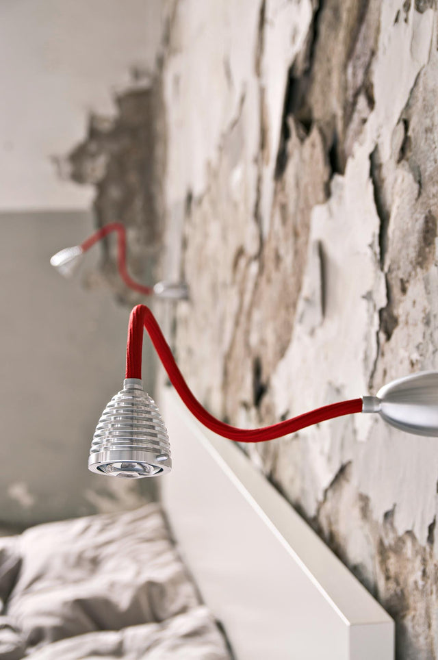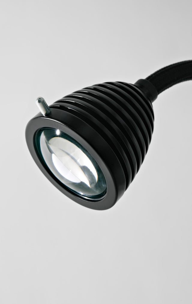 Our ATHENE wall/ceiling light has a focusable light head. The beam angle can be continuously adjusted from 40 - 90° by turning the lampshade using a glass lens optic. The flexible shaft can be flexibly adjusted to any position. It sits on a solid aluminium base and is optionally covered with a coloured textile. The LED can optionally be dimmed via Phase, Dali, Casambi or a touch dimmer on the base.