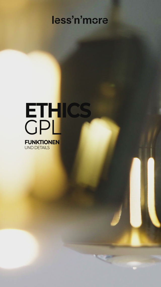 The ETHICS pendant lights have 2 light sources. The direct light shines axially through a glass lens optic with a beam angle of 85°. The indirect light source sits inside the anodized aluminium reflector and shines sideways through the lampshade made of hand-blown crystal glass. Both LEDs can optionally be dimmed via Phase, Dali or Casambi. The magnetic bicolour canopy cover (one side black, one side white) offers flexible mounting options. It enables variable spacing of the pendants. The body itself is covered with black cellular rubber, which compensates for uneven ceilings and allows flexible lateral power supply if required. A manual height adjustment is integrated into the lamp body.