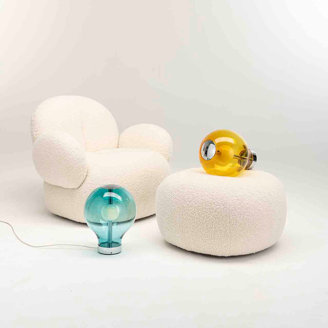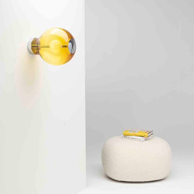Our SCOOP wall/ceiling light consists of a hand-blown glass ball. These are available in 6 different colours. The LED lighting unit is hidden inside the stainless steel tube behind another smaller glass ball. The canopy is made of polished aluminium. The light can be controlled via Phase or Casambi using the power supply integrated in the canopy. These lights are made individually on request. Color variations are possible due to the natural and hand-made glass. Delivery on request.