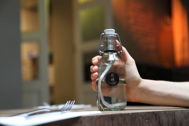 LUZIE wird auf Grund rechtlicher Bestimmungen unbefüllt geliefert. Es kann jedes herkömmliche (Bio-) Lampenöl aus Drogerien oder Baumärkten verwendet werden.