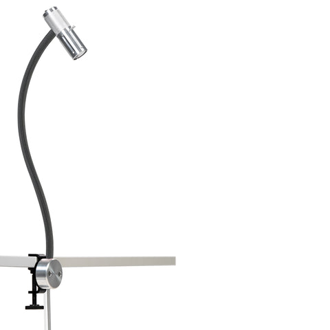 Unsere WORK Klemmleuchte verfügt über einen fokussierbaren Leuchtkopf. Der Abstrahlwinkel kann mittels einer Glaslinsenoptik durch Drehen des Leuchtschirmes stufenlos von 30 - 85° eingestellt werden. Die Flexwelle ist in jegliche Position flexibel einstellbar. Sie sitzt auf einem massiven Aluminiumsockel mit Tischklemme und ist optional mit einem farbigen Textil überzogen. Die Leuchte wird über einen Kippschalter am Kopf geschaltet und über ein Steckernetzteil mit Strom versorgt.