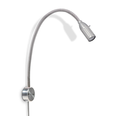 Unsere ZEUS Wandleuchte verfügt über einen fokussierbaren Leuchtkopf. Der Abstrahlwinkel kann mittels einer Glaslinsenoptik durch Drehen des Leuchtschirmes stufenlos von 30 - 85° eingestellt werden. Die Flexwelle ist in jegliche Position flexibel einstellbar. Sie sitzt auf einem massiven Aluminiumsockel und ist optional mit einem farbigen Textil überzogen. Die Leuchte wird über einen Schnurschalter geschaltet und über ein Steckernetzteil mit Strom versorgt.